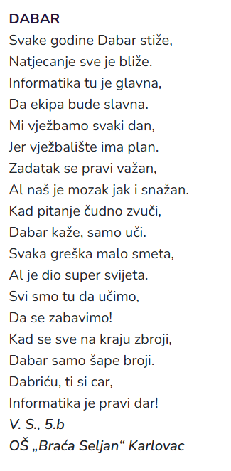 Šećer na kraju je učenica Vanessa Sertić iz 5.b razreda koja je svojim sudjelovanjem u natjecanju Dabar u stihovima osvojila nagradu.