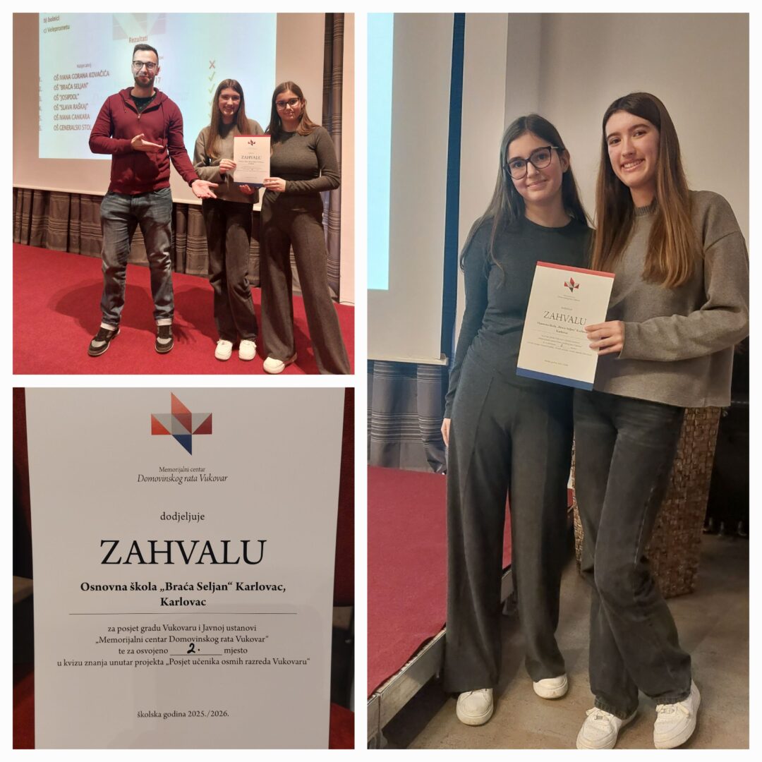 Učenici osmih razreda Osnovne škole „Braća Seljan“ Karlovac, u pratnji razrednika boravili su 12. i 13. studenog 2025.g. na dvodnevnoj terenskoj nastavi u Vukovaru u sklopu projekta „Posjet učenika osmih razreda Vukovaru“.