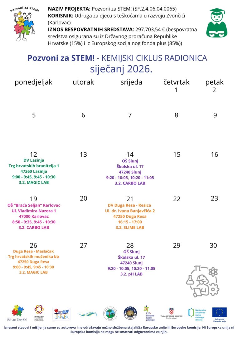 Udruga za djecu s teškoćama u razvoju Zvončići najavljuje nastavak edukativnih i interaktivnih radionica za djecu osnovnoškolske i vrtićke dobi u STEM području, a koje se provode u sklopu projekta sufinanciranog sredstvima Europske Unije naziva „Pozvoni za STEM!“ SF.2.4.06.04.0065 u iznosu od 297.703,54 €.