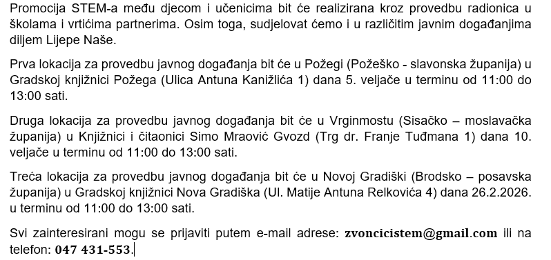 “Svi zainteresirani mogu se prijaviti na radionice putem e-mail adrese: zvoncicistem@gmail.com ili na telefon: 047 431-553.”