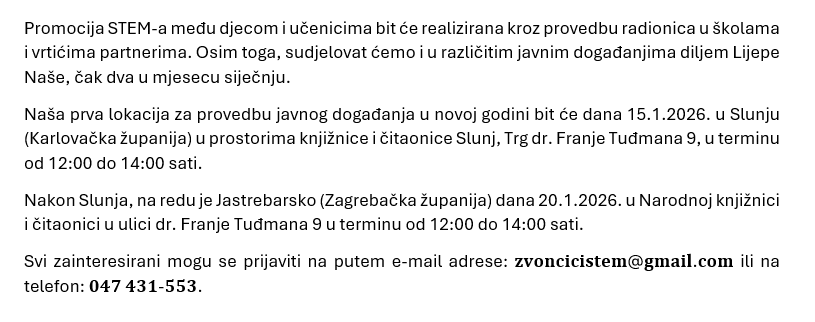 Promocija STEM-a među djecom i učenicima bit će realizirana kroz provedbu radionica u školama i vrtićima partnerima. Osim toga, sudjelovat ćemo u različitim javnim događanjima diljem Lijepe Naše. Naša sljedeća lokacija za provedbu javnog događanja bit će Ličko – senjska županija, točnije Korenica dana 4. studenog 2025. na Trgu sv. Jurja (ispred turističke zajednice) u terminu od 11:00 do 13:00 sati.